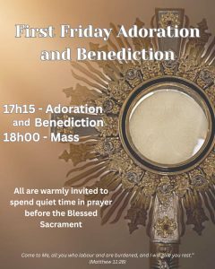 First Fridays: 17h15 Adoration and Benediction followed by Mass at 18h00.