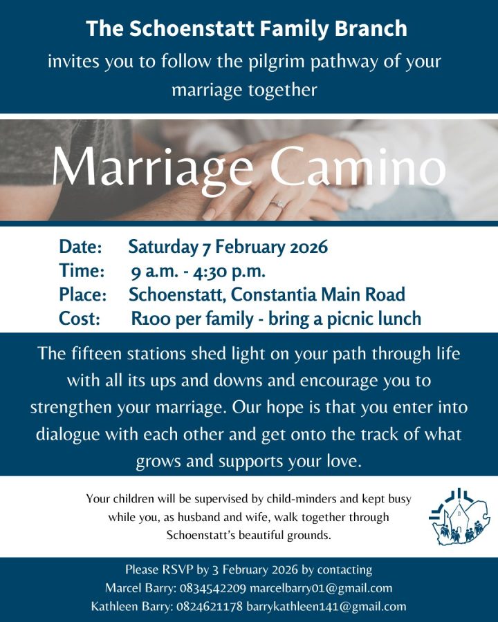 - Marriage Camino on Sat 07 February at Schoenstatt, Constantia. RSVP by 03 February. Details on the notice board.